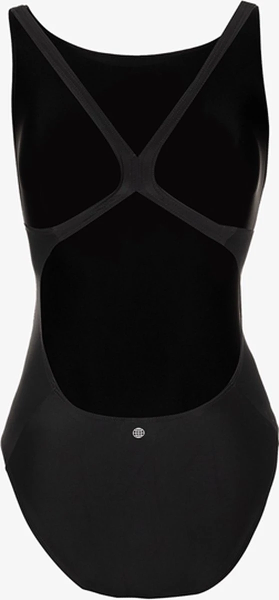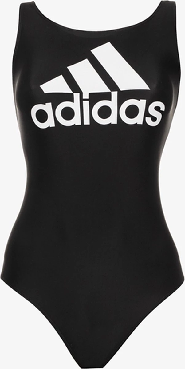 Zwart badpak van Adidas voor dames. Het badpak heeft een laag uitgesneden rug met racerback bandjes. Voorzien van een wit Adidas logo op de voorzijde.