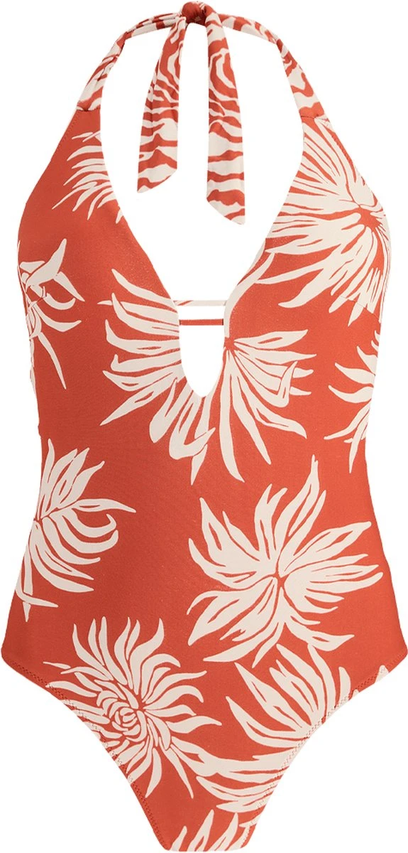 Deltia Halter One Piece is een badpak in roestkleurige bloemenprint. Het heeft een lage v-hals, een lage rug en een hoog uitgesneden beenopeningen. Met vaste padding en nekbandje in nautilusprint.