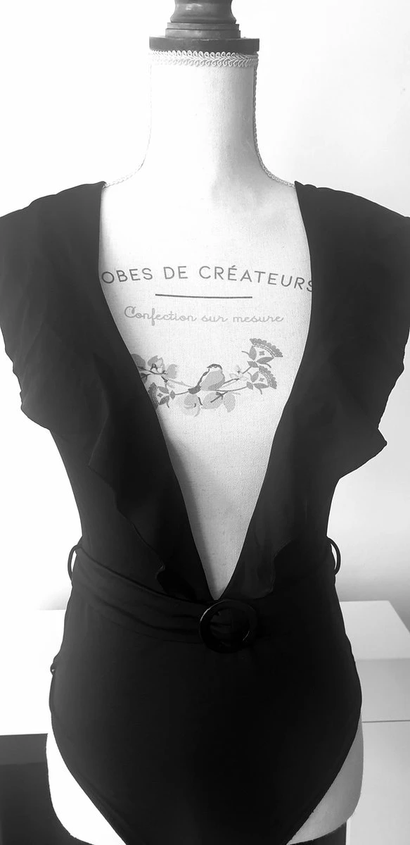 Zwarte badpak van Lycra met V hals volants voor en achter met riem aan centuur.