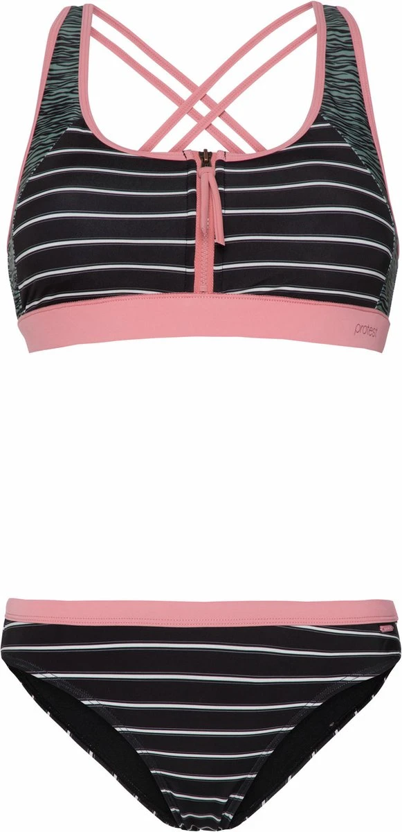 Ontdek de prachtige PRTATINS van Protest. Deze bikini maakt deel uit van onze SUP- en surfserie met zwemkleding die speciaal is ontwikkeld voor actie. De bikini bestaat uit een mix van prints en combineert onze zebraprint met een zomerse streep. Het sportieve model is ideaal voor wat actie op het water. De top heeft een ritssluiting aan de voorkant: een speels en praktisch detail. De uitneembare foam pads bieden extra ondersteuning wanneer dat nodig is. Deze pads drogen ook snel, wat voor een comfortabel gevoel zorgt. De bikini heeft een racerback-stijl. De stof biedt UV-bescherming met factor 50. Dit betekent dat de huid eronder wordt beschermd tegen de zon. Als onderdeel van ons Green-Up-initiatief is dit model gemaakt met gerecyclede polyester, een materiaal dat sterk en duurzaam is. De stof is PFC-vrij om het gebruik van deze chemische stof te verminderen en daarmee de schade aan het milieu te beperken. De PRTATINS van Protest is de ultieme bikini voor een leuke tijd in en op het water.