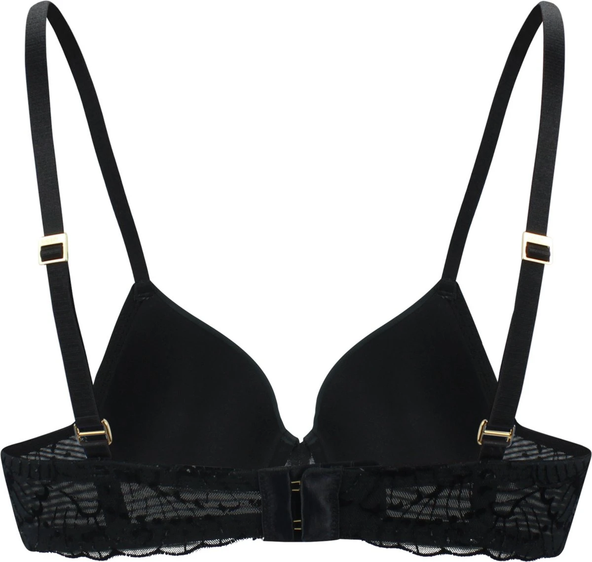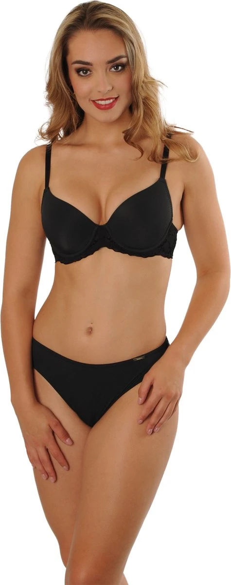 De Salome T-shirt BH is een fijne zwarte bh met net dat beetje extra! De cups en het middenstuk zijn gemaakt van microfiber stof en afgewerkt met kant. De achterkant is van mesh met een mooie flock print. Om nog meer mysterie en elegantie uit te stralen is er een bijpassende Salome string en Salome brazilian. Ons model is 175cm en draagt maat 75B.